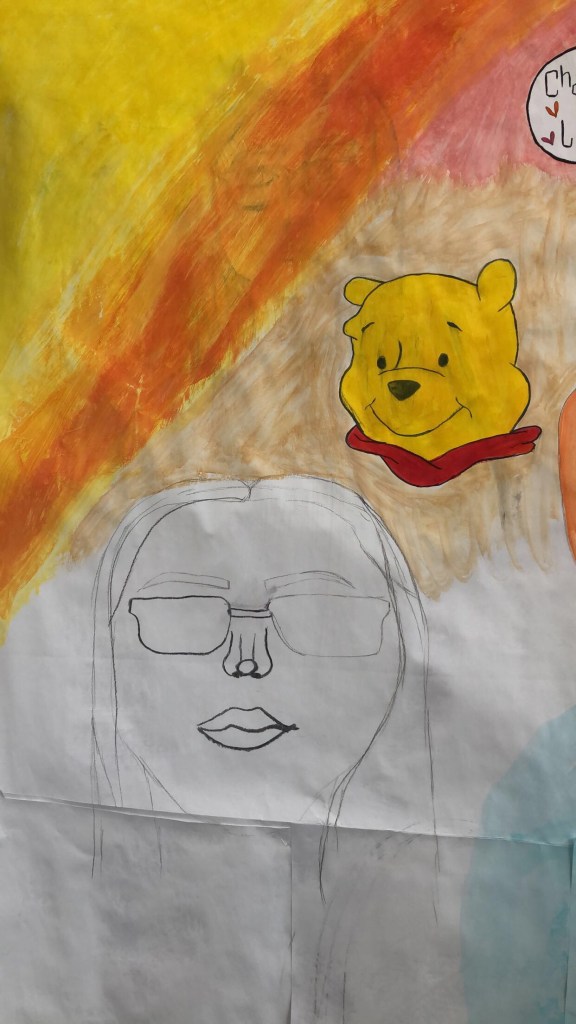In today’s lesson I began working on a very large piece. This piece is based on me and what has made me the person I am today. Things like; how I looked over the last 19 years, favourite food and drinks from when I was younger,favourite childhood programs etc. I began by sticking sheets of paper together to create a large piece of paper. I then covered the paper on white emulsion paint to stiffen the paper. After the paint dried I started using charcoal to begin drawing a self portrait from today, a portrait of me from when I was in high school and a portrait of me when I was a toddler. Afterwards I began to cover the white by adding acrylic paint. Whilst the paint was drying I started to add things that resembled my childhood. I will continue in next weeks lesson