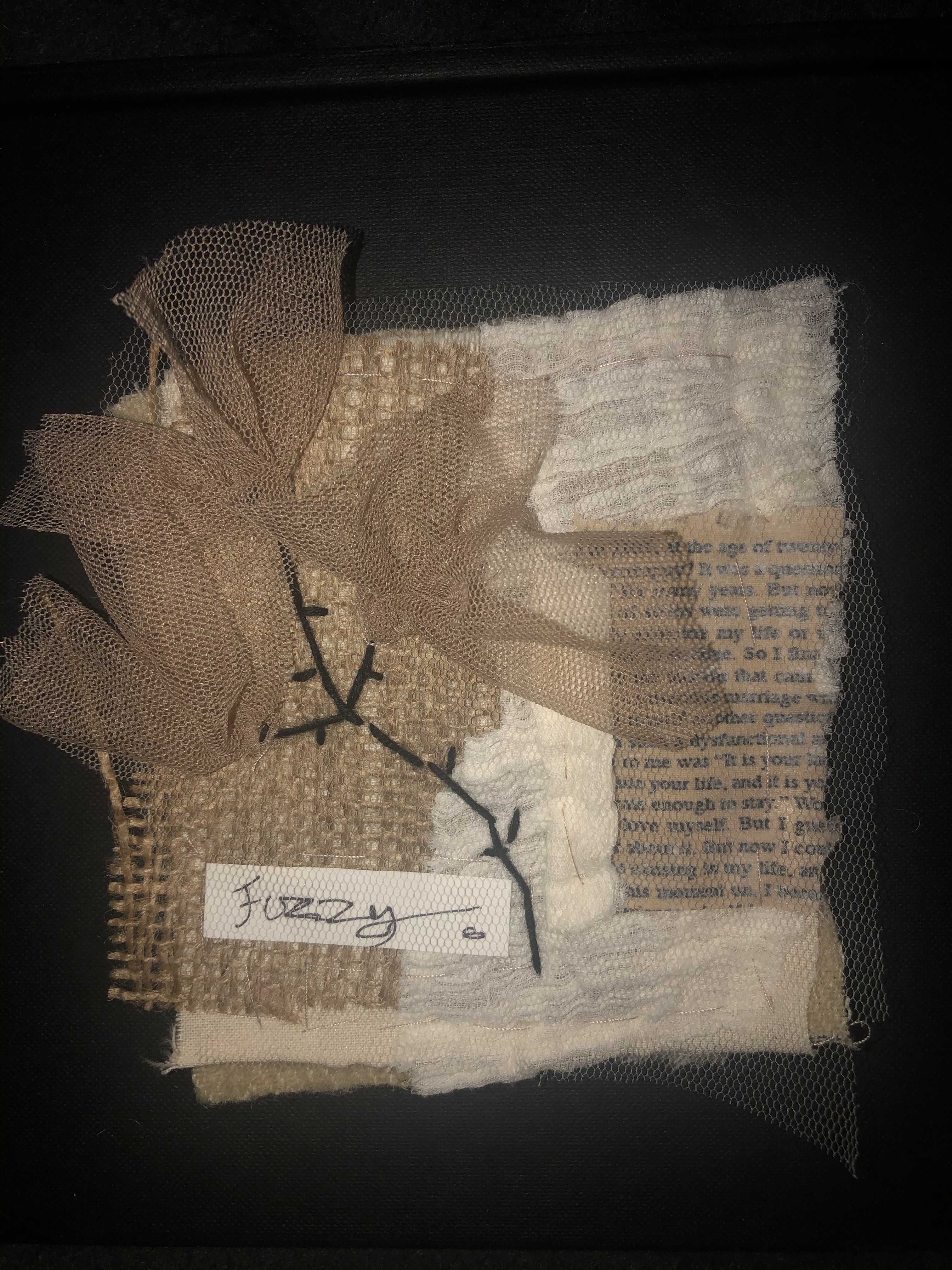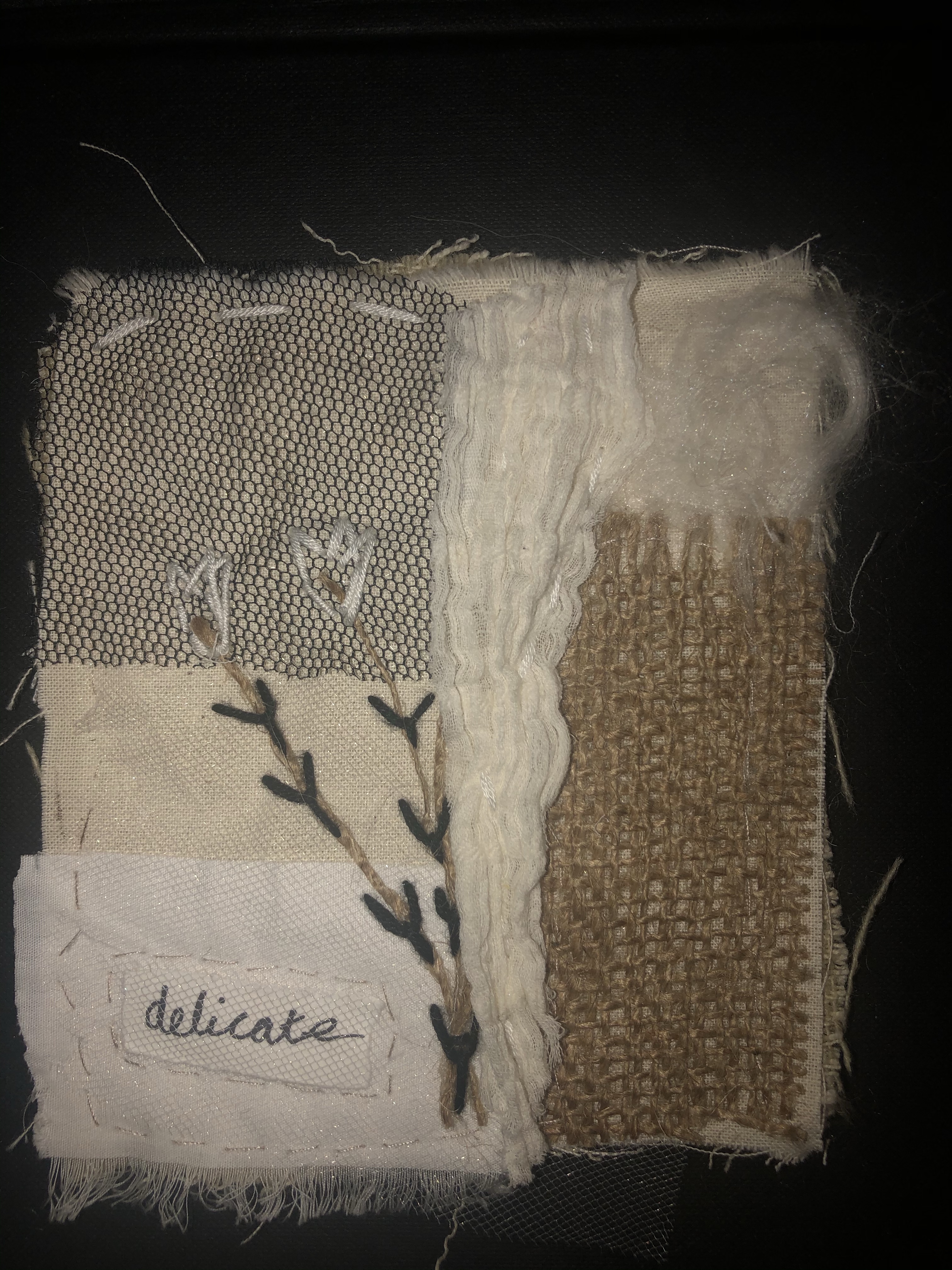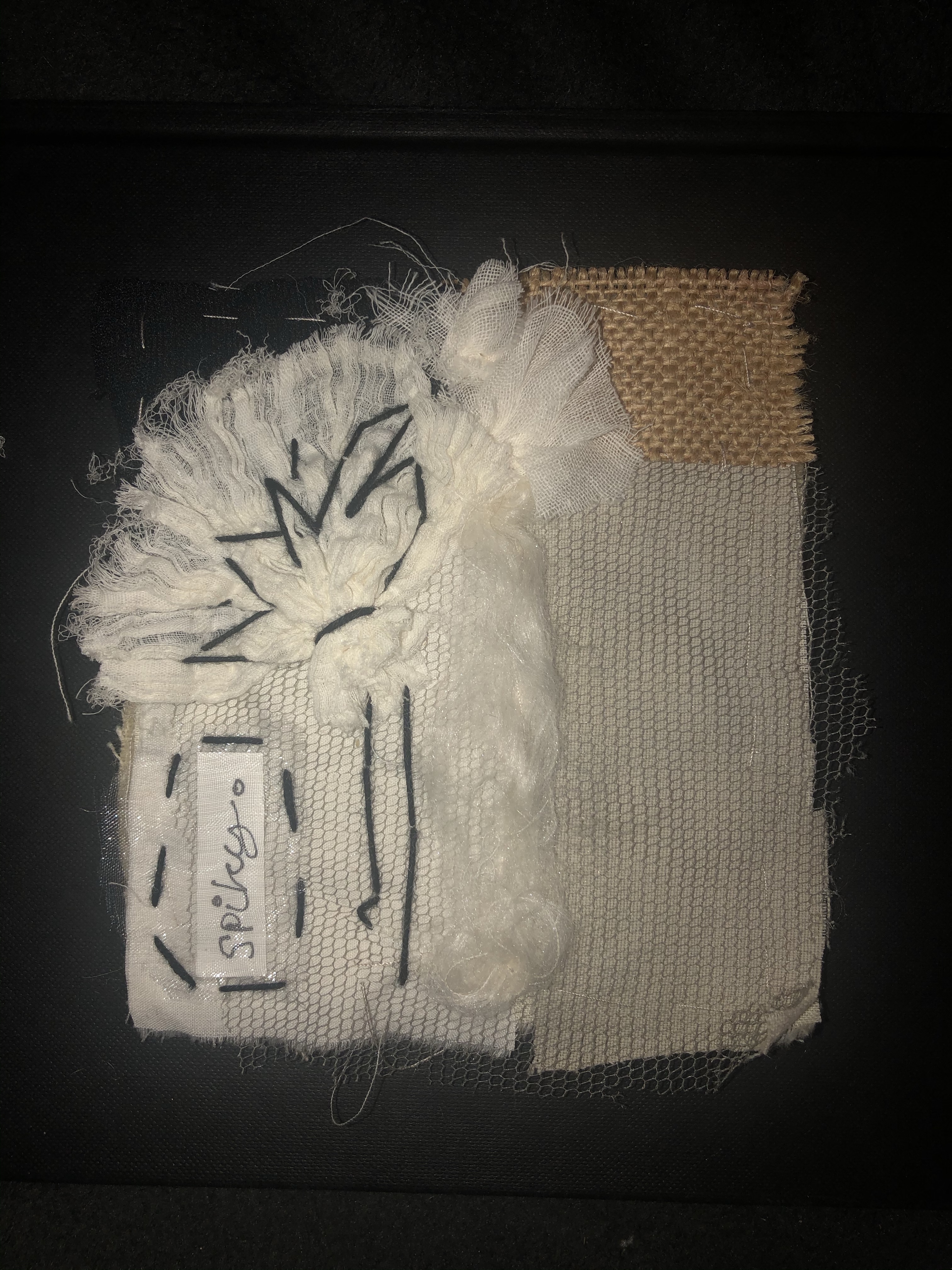 I really enjoyed creating these pieces. I love stitching in all different ranges. I was working on the first piece for quite a while as I wanted it to be perfect, but when I do that I’m extremely slow. After talking to my tutor about how one of the things I need to do is step out of my comfort zone. So to start doing that I will work on one area of a piece of work and do it extremely fast so I’m not thinking about it too much. that’s what I did on the second piece and I honestly prefer it to the one I did delicately. The second one was my favourite to create however the one that looks the best to me is the third one as the textures are interesting. I feel as though I raised the surface a bit more in the last one. To create each one of these I layered different types of fabric and then I pinned it in place. I then took a really fine thread and using running stitch to secure my first layer in place. Then adding different materials to add texture and securing it with a thicker darker thread to create the seed heads. I’ve also added text to each one by securing it under netting. The words each describe the type of seed head.