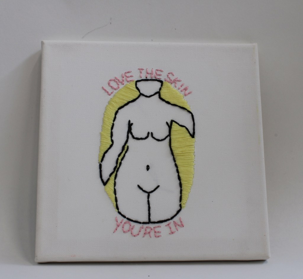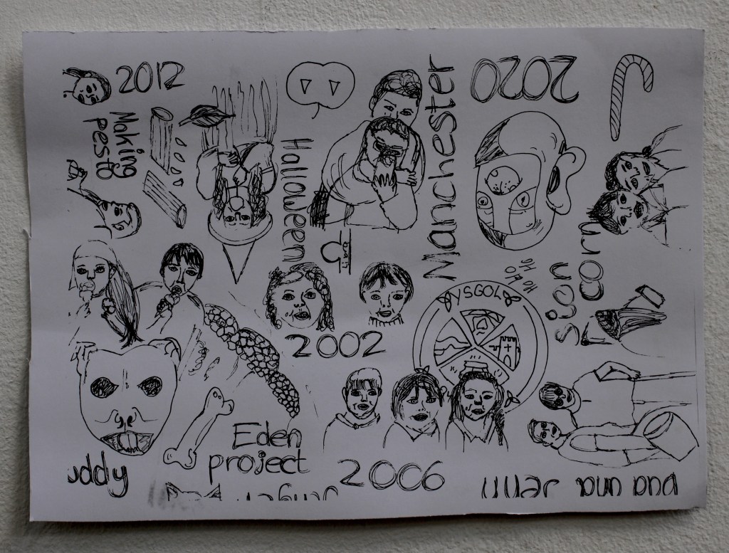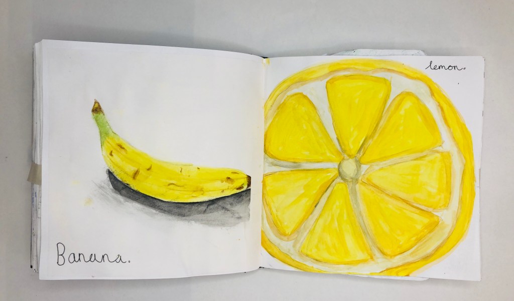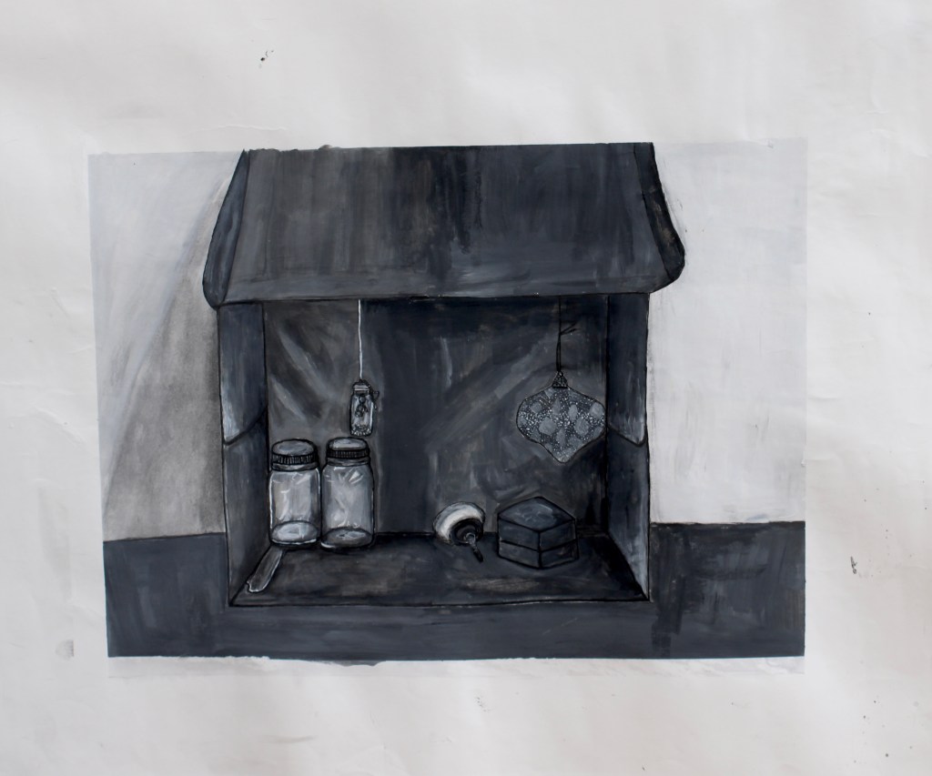 3D magic lantern made out of boxes and tubes with a Lense. Painted with black acrylic. Pencil and charcoal with black and white acrylic paint finished with an ink pen. On A2 paperWatercolour life drawing in sketchbookIllustration page of photos with black ink penRaised stitch piece with a range of materials Canvas painted with acrylic and stitched into with embroidery threadPop up page. Watercolours Embroidered canvas Watercolour illustration on A5 paperSketchbook page using marker pens.