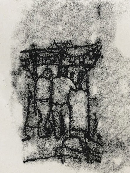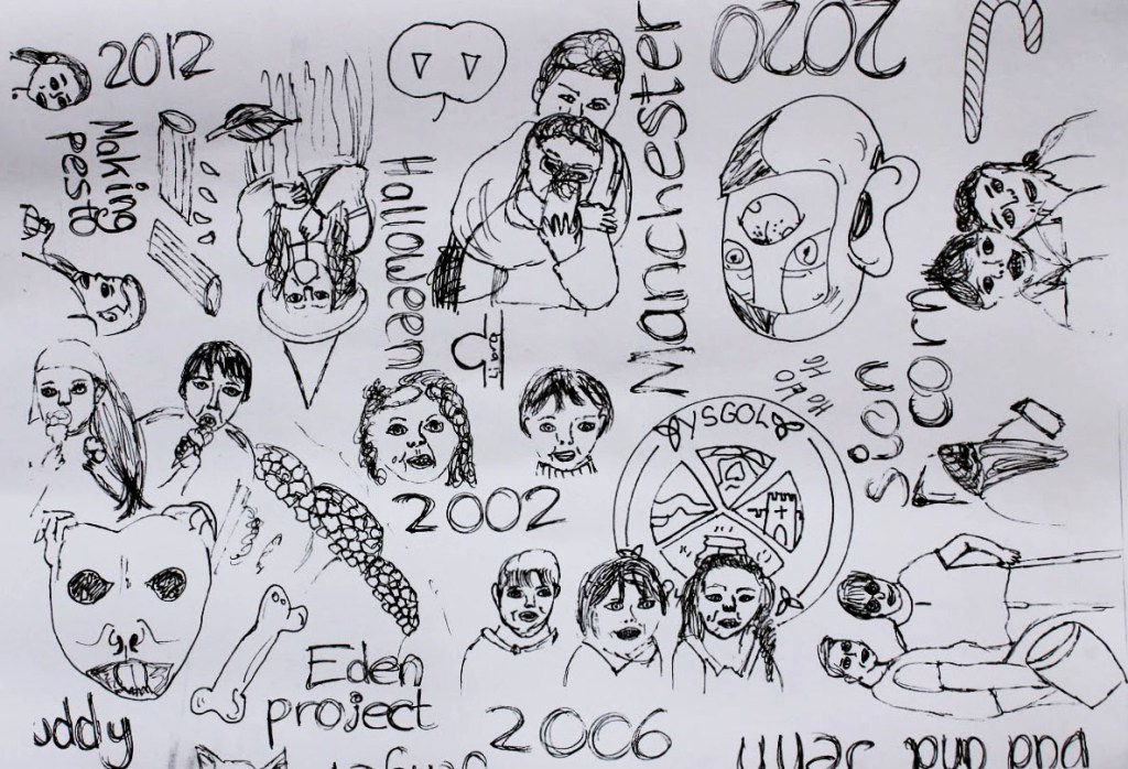 This is an illustrated development page of childhood memories that I created during the process of the large painting. I used an ink pen and took reference from photographs and memory.