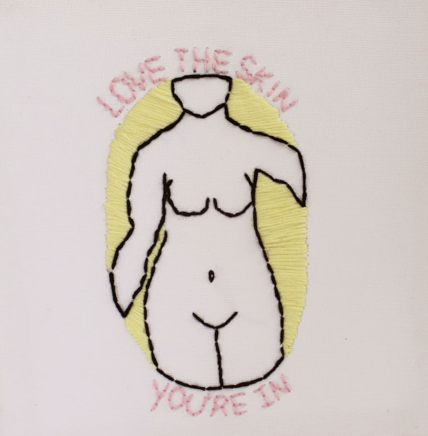 This canvas piece was part of my body positive project. This was personal to me as I wanted to be happy in my own skin and appreciate the body I was born into. I used yellow, black and pink embroidery thread. 20×20 cm canvas.