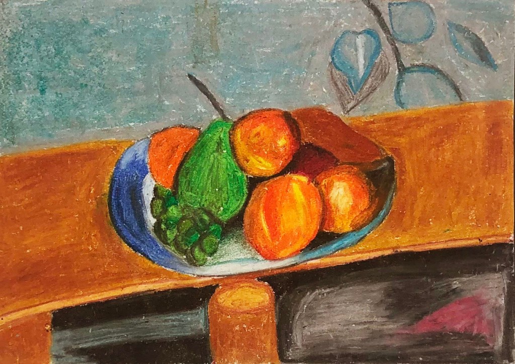 This is an oil pastel piece which is my version of the painting by Paul Cezanne. This was my first time using oil pastels and I found them very easy to use.