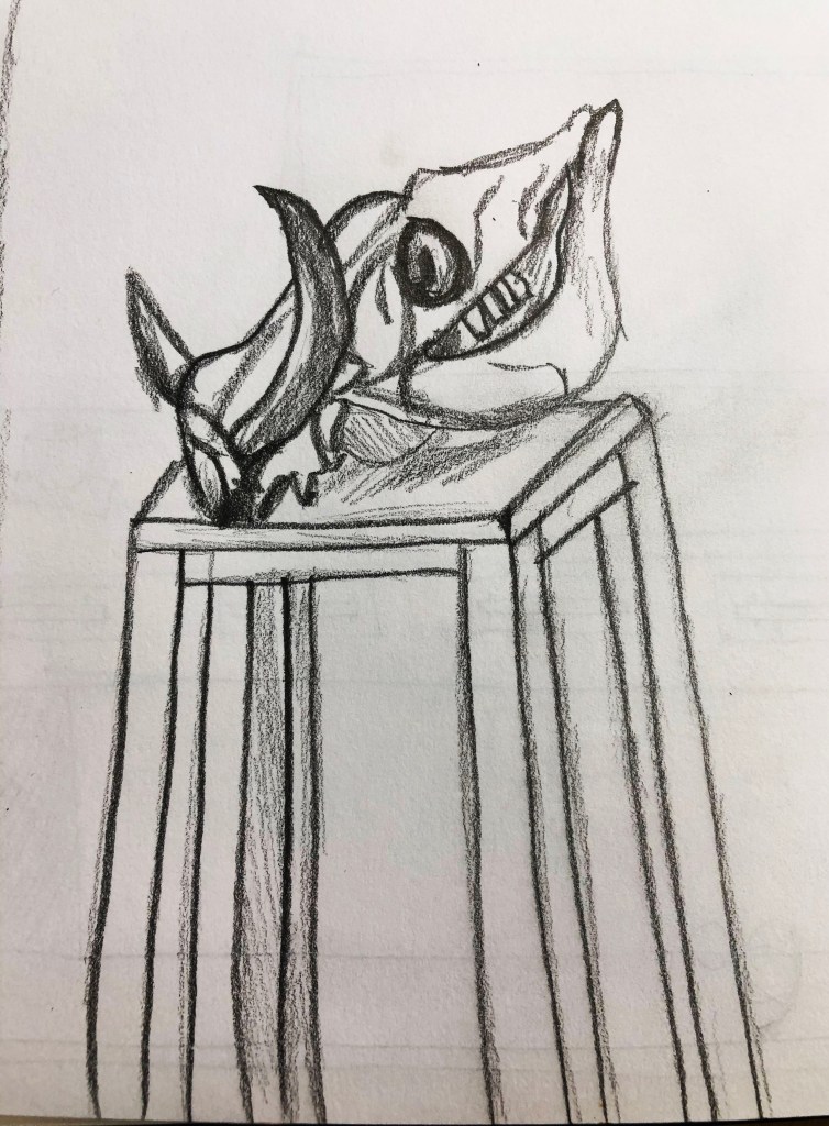 This is a quick observational drawing of a skull using compressed charcoal and pencil.