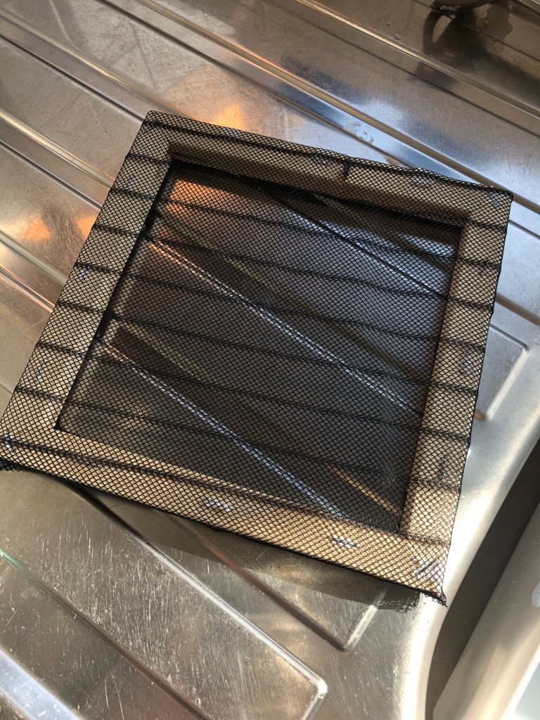 I began my day by adding tea and coffee which I made the previous night) to half of my remaining pulp. I wanted to get a nice brown colour which I did however it wasn’t as pigmented as I would’ve hoped. I did add more coffee but it didn’t really do anything. After yesterday I wanted to see if making a new mould and deckle would make my process more effective. I used a smaller canvas this time and used the remaining magnetic door frame material. the only way I can describe this material is the material that is underneath a dress that you would wear for fancy dress. It’s that kind of mesh netting. I used different pins this time and pulled the material very tight so that it would fit really close to the frame so that it wouldn’t sag like the original mould that I had created. Instantly after making I knew that it was going to work a lot better. Unfortunately I didn’t take images of the process making the mould and deckle which is really disappointing.