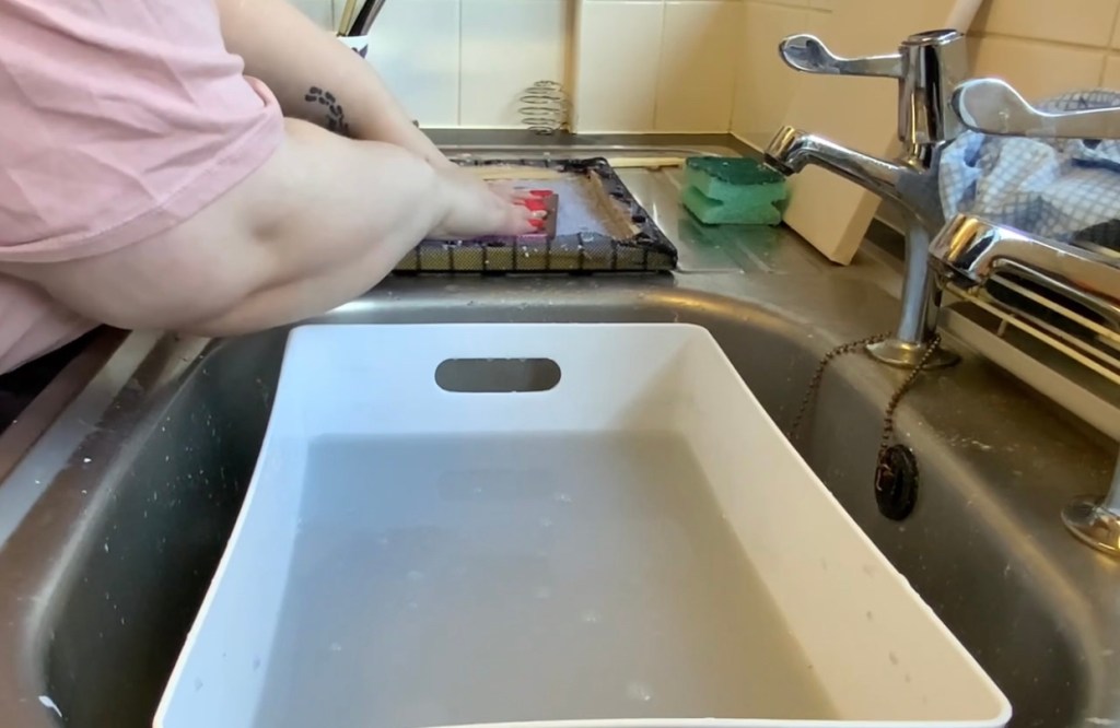 The first thing I did was find a material that would work best for creating the mould and deckle. I started off by using a ready made canvas as it was already in the form of a mould and deckle. However this didn’t work. The water did not go through the canvas which means I had to find a new material to try out. I decided to try tights next as I’ve seen it being used to strain things. This method did work however it took a while for the water to drain as you can see in the video above. But also I had a feeling it may stick and would be hard to peel the paper off when taking it out of the mould. Tights are extremely thin and not very sturdy so I decided to keep thinking about an alternative before using tights indefinitely. After looking around my house I found a magnetic door screen in the attic and and tried it out. It worked extremely well so I cut a piece out and used pins to attach it to the frame from the canvas I used previously.