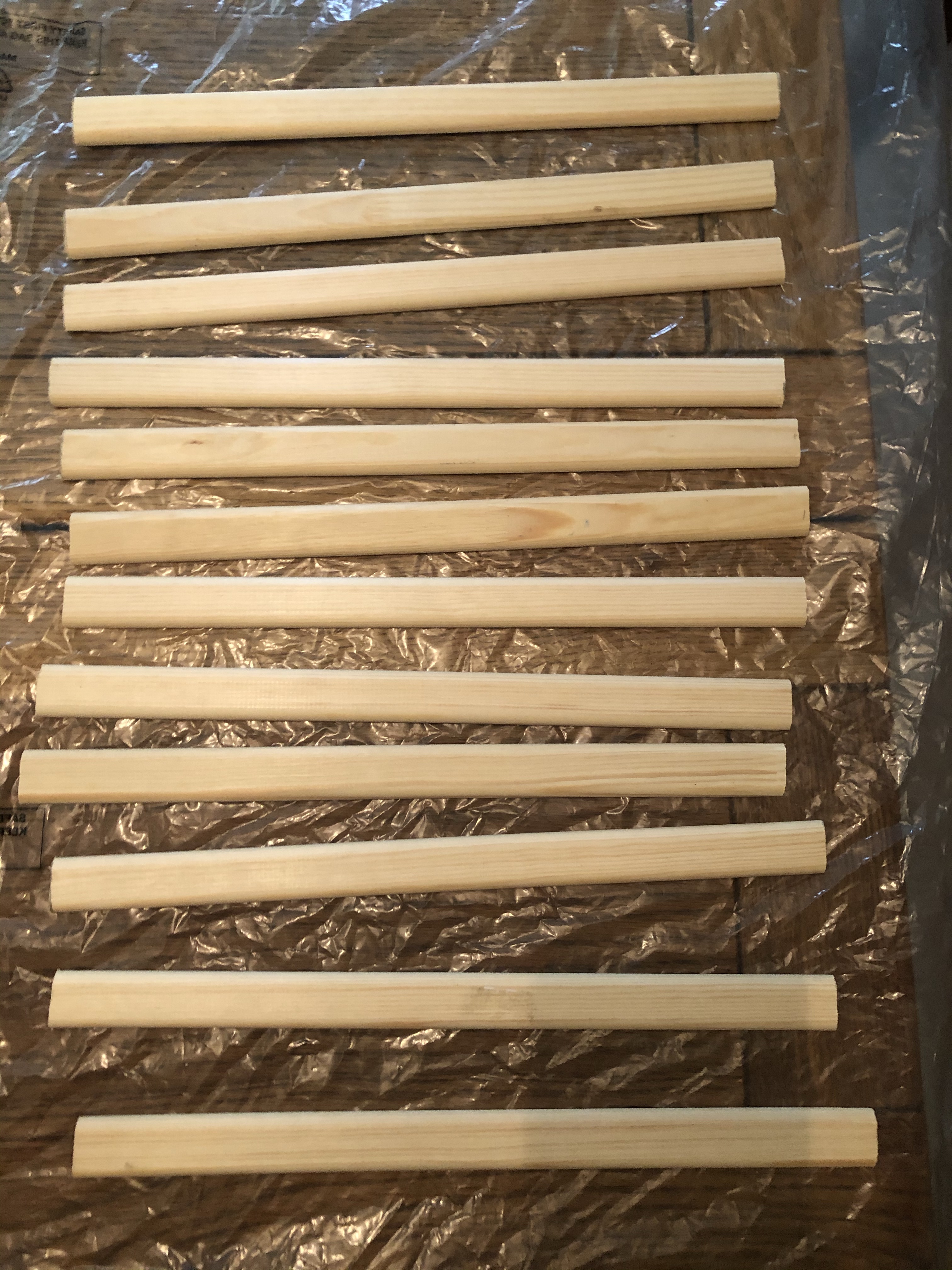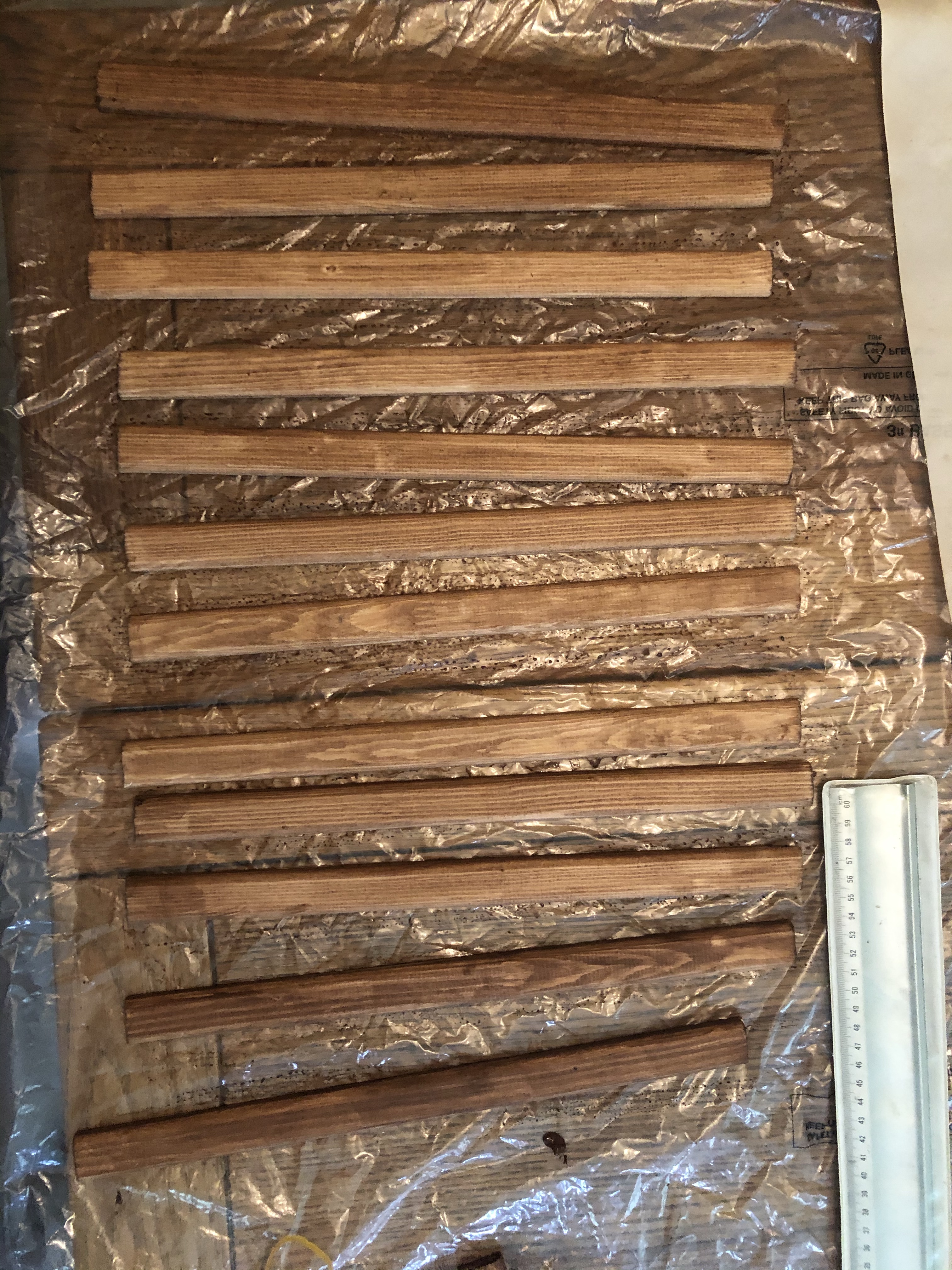 The next step for me was to cut strips of wood to frame the shibori dyed fabric as a scroll. I picked up these strips from Stermat and cut them down to the length of 35cm. I wanted them to leave about 2cm of space on either side of the fabric as the fabric is 31cm. I wanted to stain the wood with varnish however the varnish i had in the house wasn’t dark enough. Then I tried brown shoe polish but it showed up with quite a red undertone. Then I decided to use watered down acrylic and was extremely happy with the outcome.